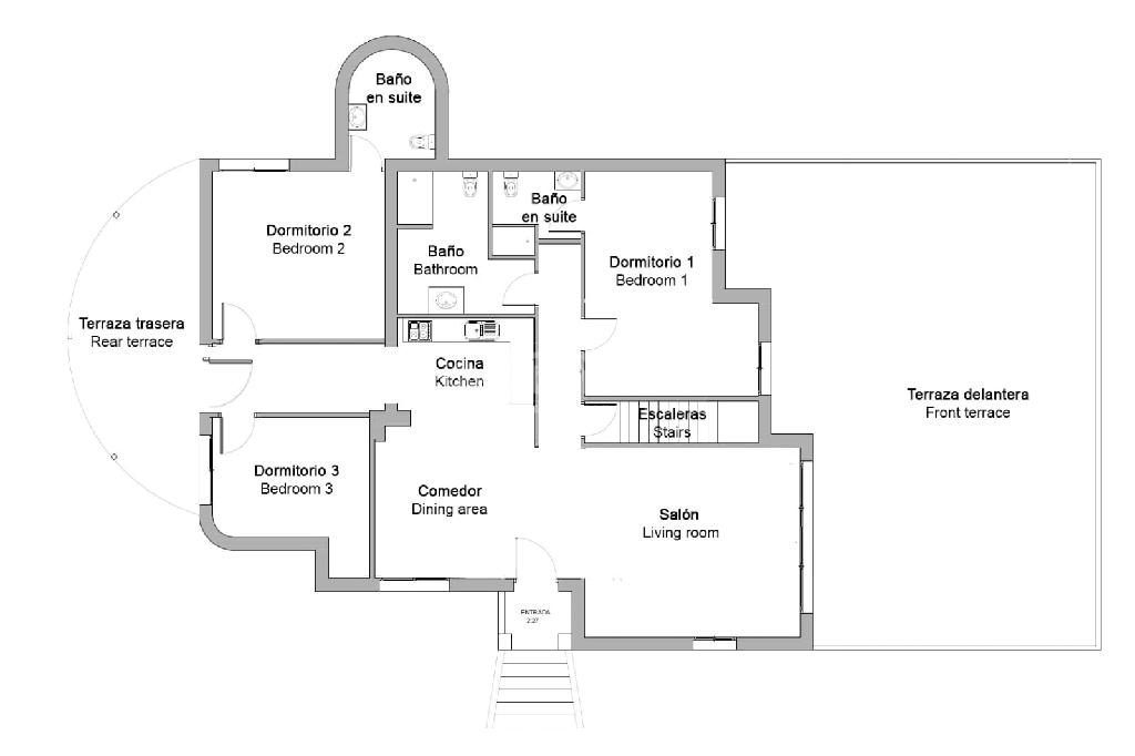 La casa principal, recientemente reformada, se distribuye en una sola planta, lo que la hace muy cómoda y funcional. Cuenta con un luminoso salón-comedor de concepto abierto con moderna cocina americana totalmente equipada y acceso directo a una gran terraza soleada con preciosas vistas, 3 dormitorios con armarios empotrados y 3 baños completos, dos de ellos en suite. Además, dispone de ventanas y puertas nuevas, pintura interior y exterior reciente, aire acondicionado y termos de agua nuevos.